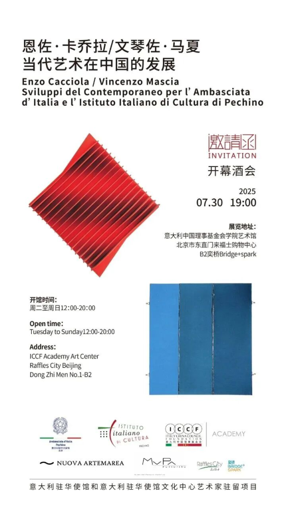 L’ICCF è lieto di invitarvi all’inaugurazione della mostra “Enzo Cacciola / Vincenzo Mascia” che si terrà il 30 luglio alle ore 19, organizzata congiuntamente dall’ICCF Academy Art Center e dall’Istituto Italiano di Cultura di Pechino.