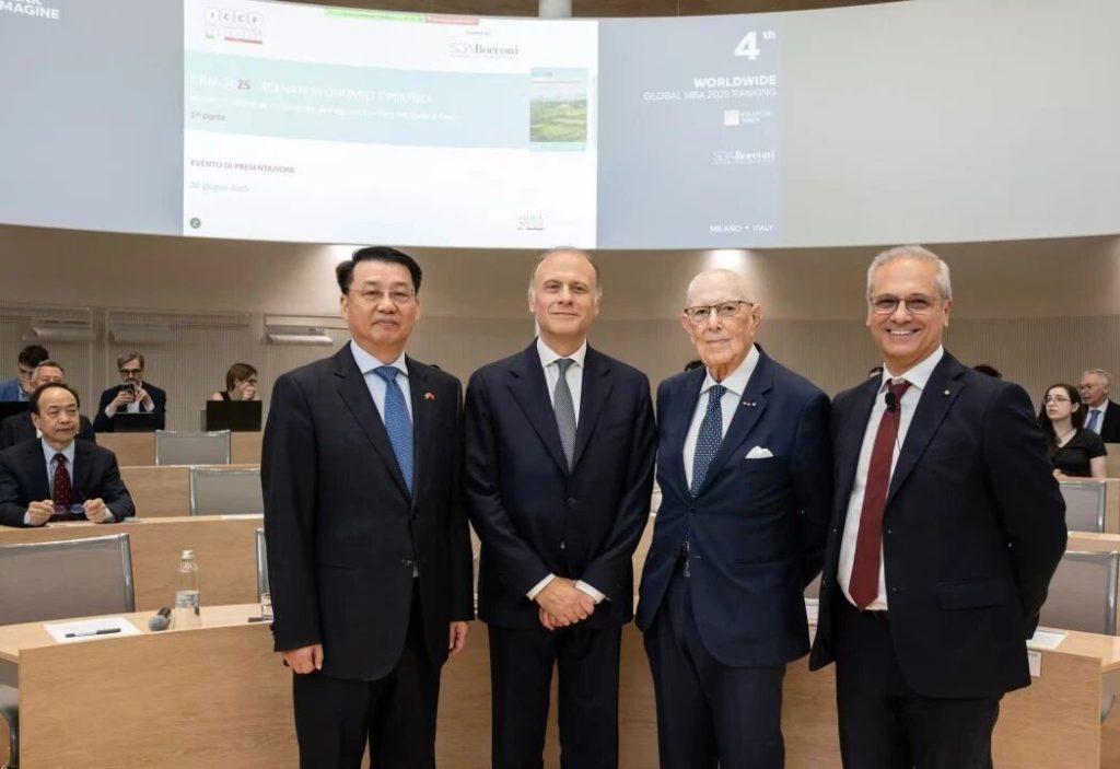2025年6月20日,意中理事会基金会《2025中国年度报告》发布会在米兰著名学府博科尼大学隆重举行。中国驻米兰总领事刘侃先生亲临现场并发表致辞,负责经济商务事务的参赞耿协威陪同出席。意中理事会基金会主席马里奥·博塞利(Mario Boselli)和博科尼大学管理学院院长斯特凡诺·卡塞利(Stefano Caselli)也莅临现场,分别致辞欢迎。